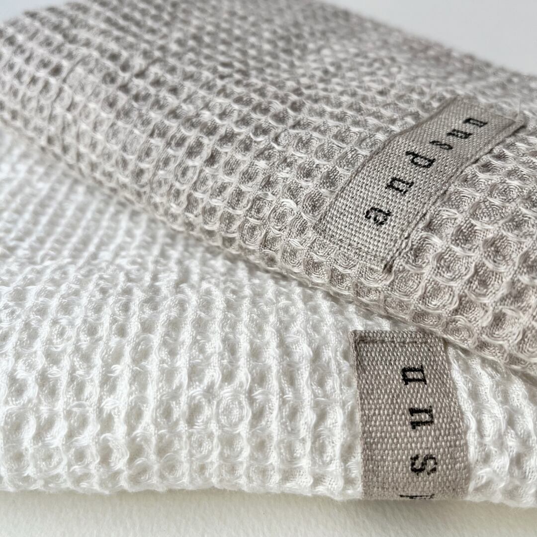 このタオルは、リネン100%のワッフル生地で作られており、高い吸水性と速乾性を兼ね備えています。しっかりとした生地感ながらも軽やかで、毎日の使用にぴったり。ホワイトと生成りの2色をそれぞれ選んでいただき、ギフトボックスにおつめします