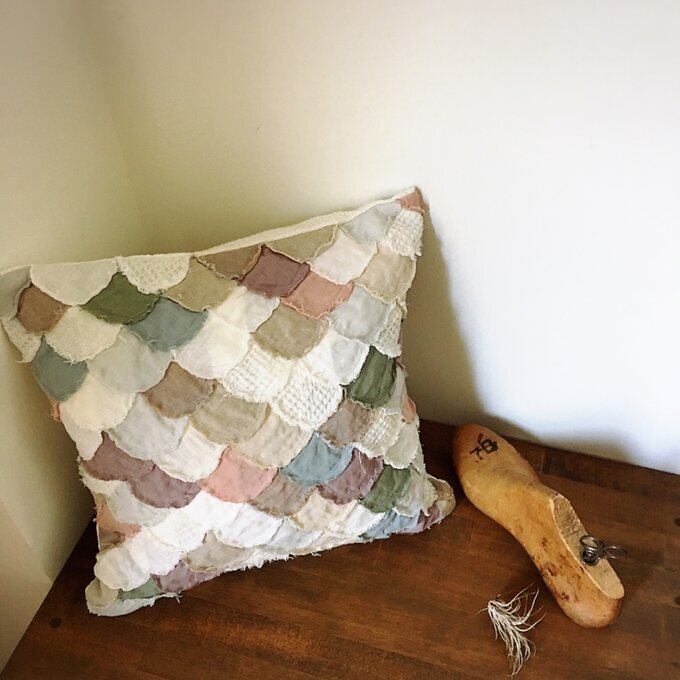 色々なリネン100%の生地をウロコの形にして一枚一枚縫い合わせクッションカバーにしました