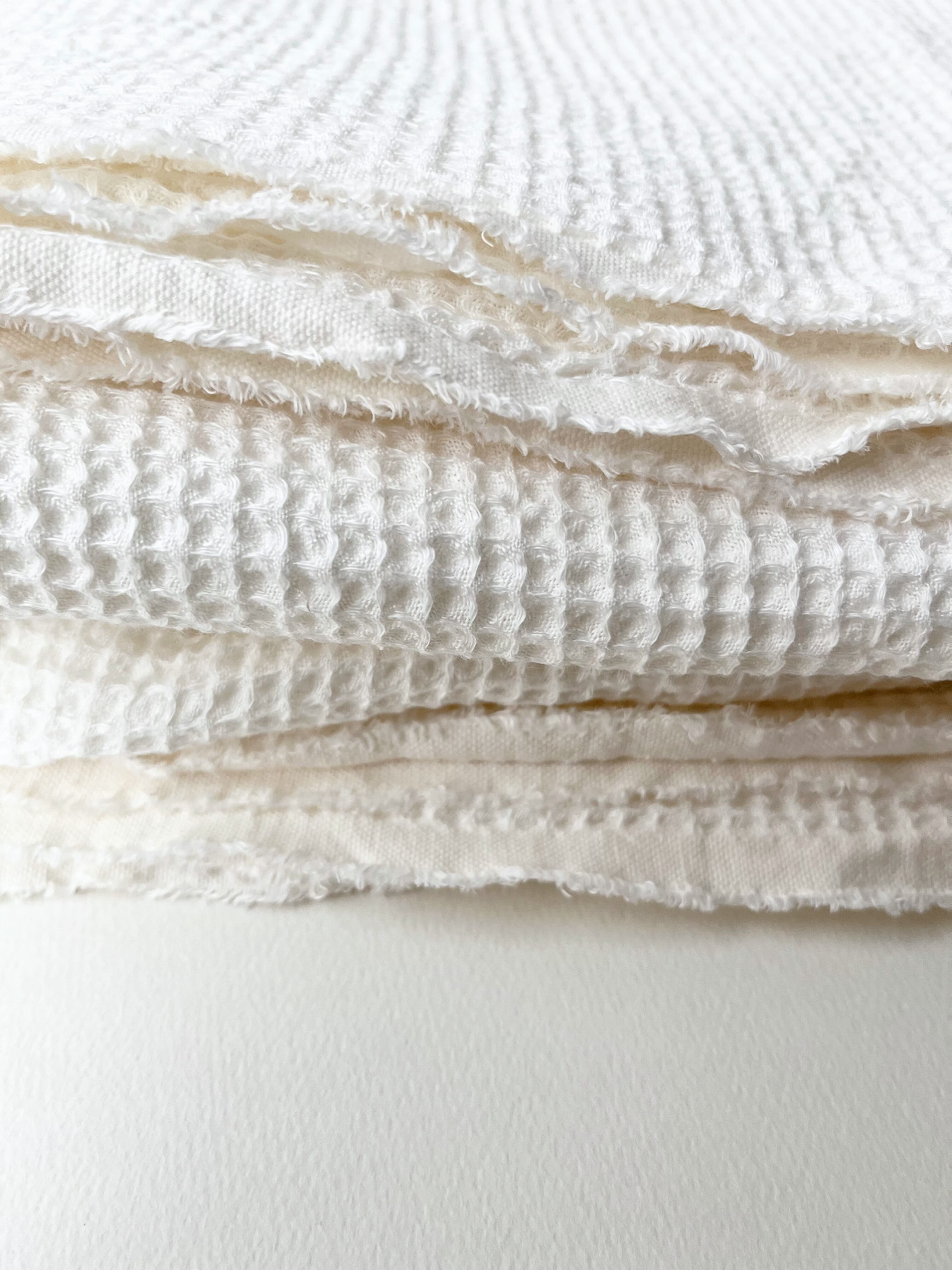 ヨーロッパ産のリネンを国内で製織されたリネンワッフル生地は、自然な風合いと高い吸水速乾性を兼ね備えています。数量1で50cmの長さがあり、1升の厚さは約5~7mmですので、さまざまな用途にご利用いただけます。柔らかで通気性にも優れているため、肌触りも良く快適です。